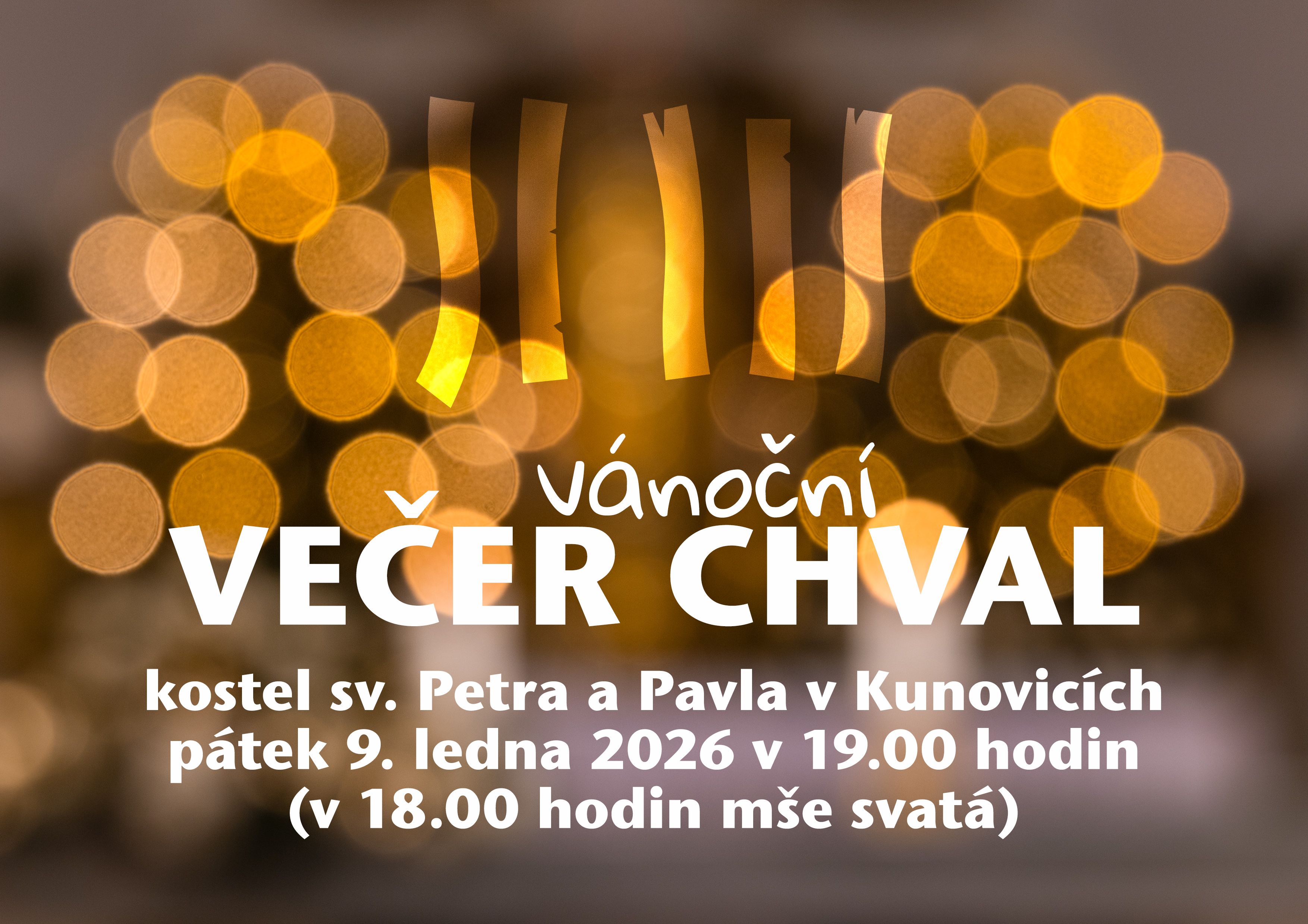 Všichni jste srdečně zváni na vánoční Večer chval, který bude v pátek 9. ledna 2026 v 19.00 hodin v kostele sv. Petra a Pavla v Kunovicích. Po této modlitbě může setkání pokračovat na farním domečku.