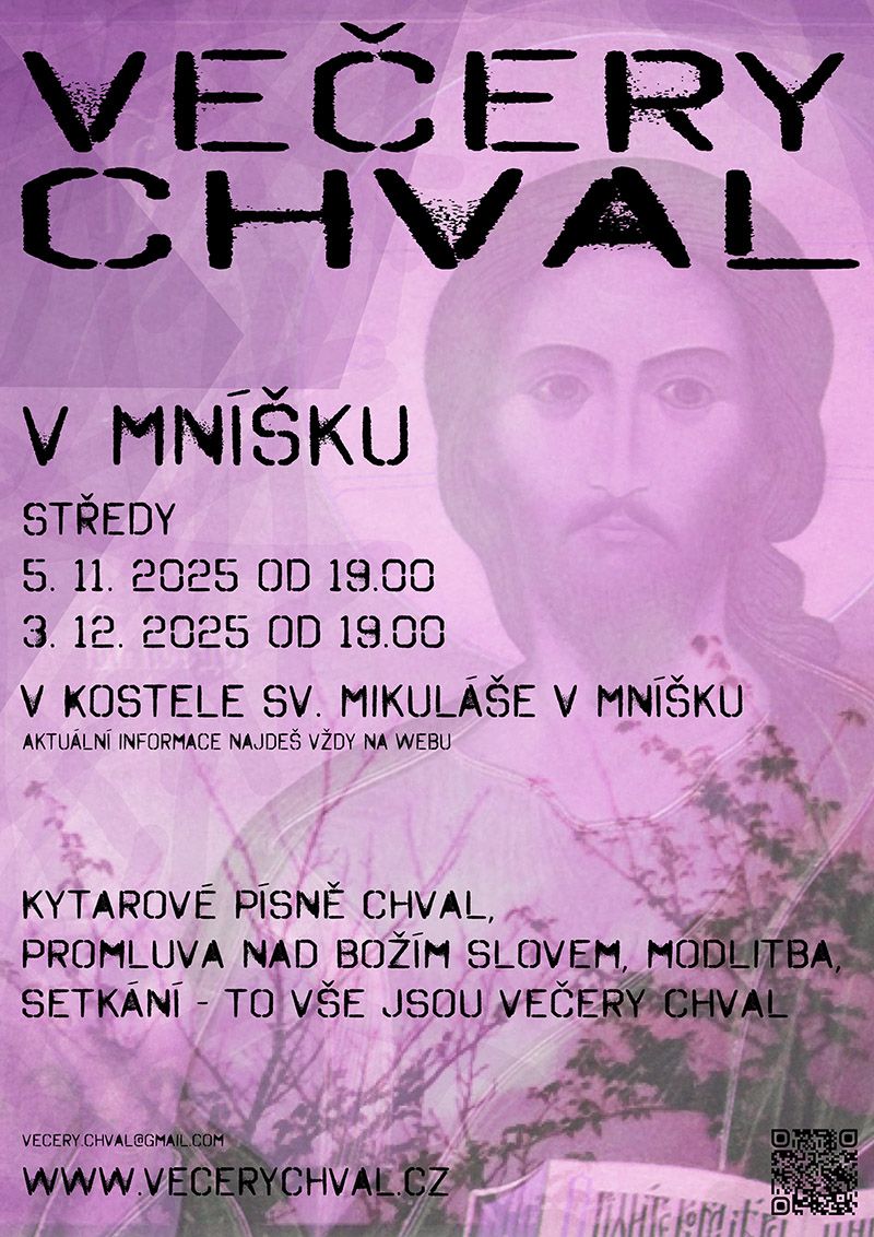 Po několikaleté přestávce budou od letošního roku pokračovat večery chval také každou 1. středu v měsíci od 19.00 v kostele sv. Mikuláše v Mníšku (původně ve Vratislavicích).