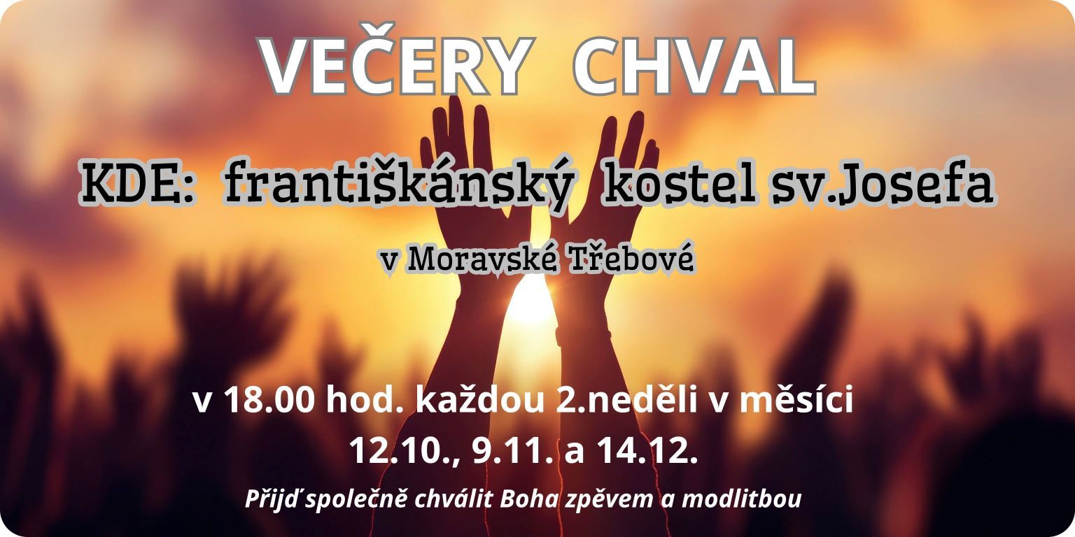 Večery chval v Římskokatolické farnosti Moravská Třebová probíhají vždy v klášterním kostele sv. Josefa, každou 2.neděli v měsíci od 18:00, kromě letních prázdnin.