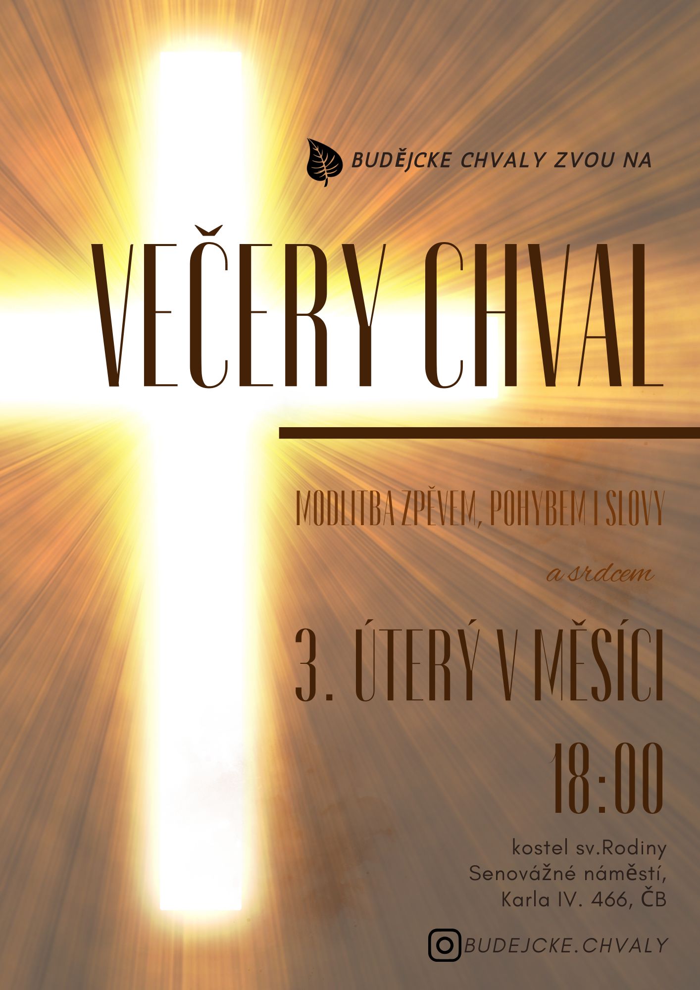 Modlitební společenství z Českých Budějovic Vás zvou na Večery chval ve Svaté Rodině, které se konají od září do června každé třetí úterý od 18 hodin v kostele Svaté Rodiny v ulici Karla IV. v Českých Budějovicích. Konkrétní termíny večerů jsou zobrazeny níže. V případě dotazů nás prosím kontaktujte na emailu budejckechvaly(zavináč)gmail.com . Níže jsou též uvedeny Večery chval ostatních společenství, které se konají nepravidelně v Českých Budějovicích a okolí.
